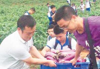 在耒阳学农基地,师生走进田间地头帮农人收茄子。