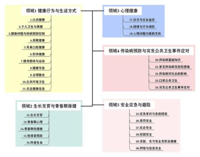 清晰,5个范畴分别为健康行为与生活方法、生长发育与青春期保健、心理健康、传染病防备与突发公共卫生事件应对、安全应急与避险,这5个范畴相对独立,自成体系,又相互影响。