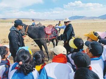 格乃桑登介绍,自4月26日正式开设马术课以来,现在理塘县城已有9批学生上了马术课。马术课分为3个阶段——1-3年级,上课地点在教室,讲堂内容主要为马术理论知识,包含知道马的品种,差异马的大小、年龄,马具的运用等基本常识;4-6年级,是理论实践相结合,上课地点从教室移到赛马场,通常是学生牵着马儿四处走走,或是骑上马背,教练牵着缰绳,绕场一周,加深与马的互动;7-9年级,在安全前提下,要求学生能驾御马匹,能独自骑马驰骋。