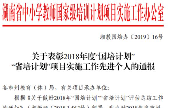 湖南省中小学教师国家级训练方案项目实施工作办公室近日下发《关于赞誉2018年度“国培方案”“省培方案”项目实施工作先进个人的通报》(湘教国培办〔2019〕16号)文件,我校黄月初、樊希国、刘国彬、杨群英等四位教师被评定为“优异训练者”,李志艳教师被评定为“优异班主任”。